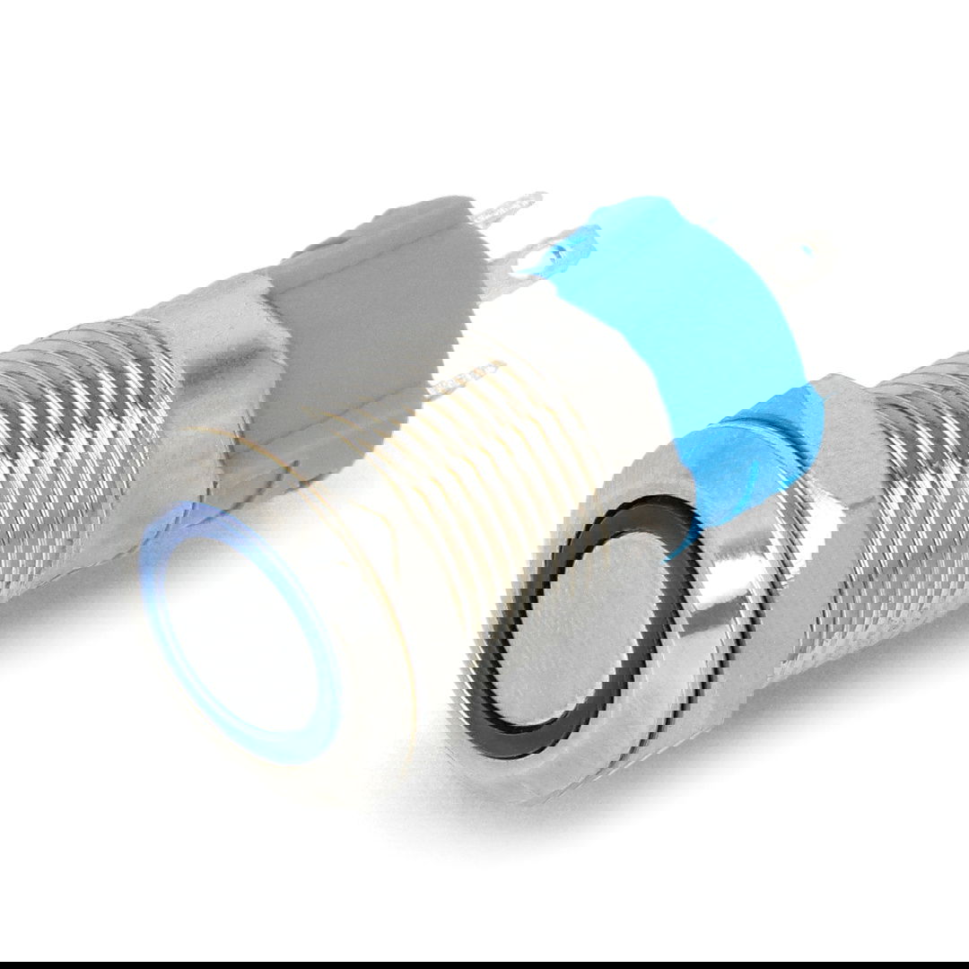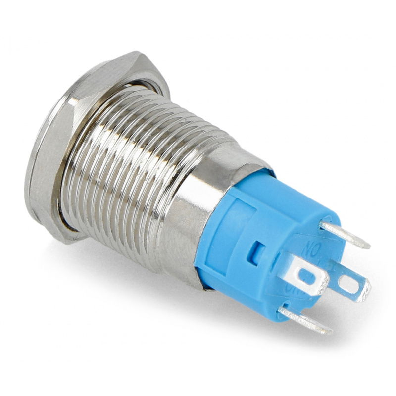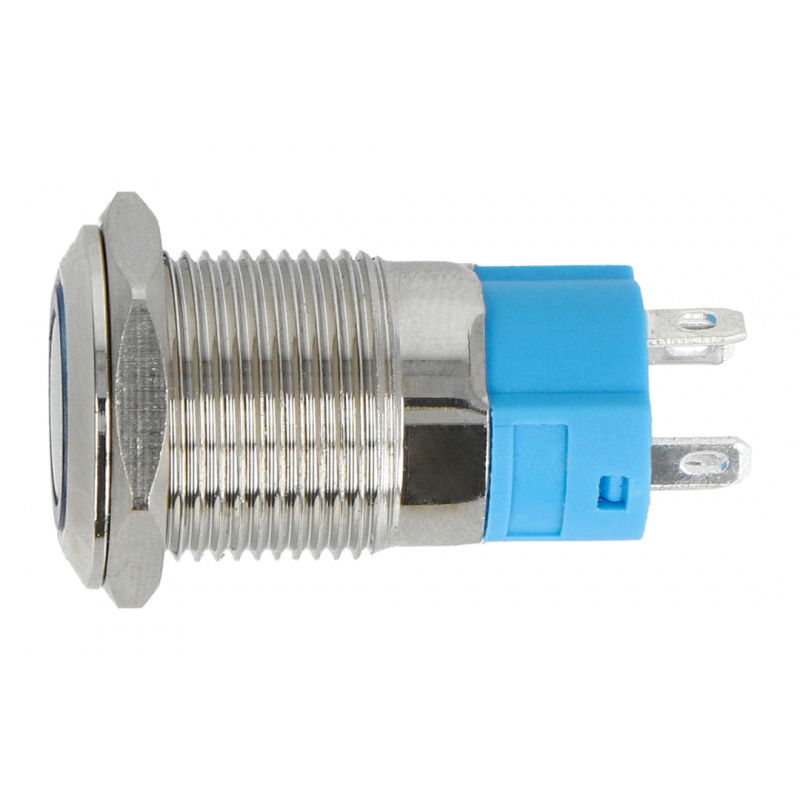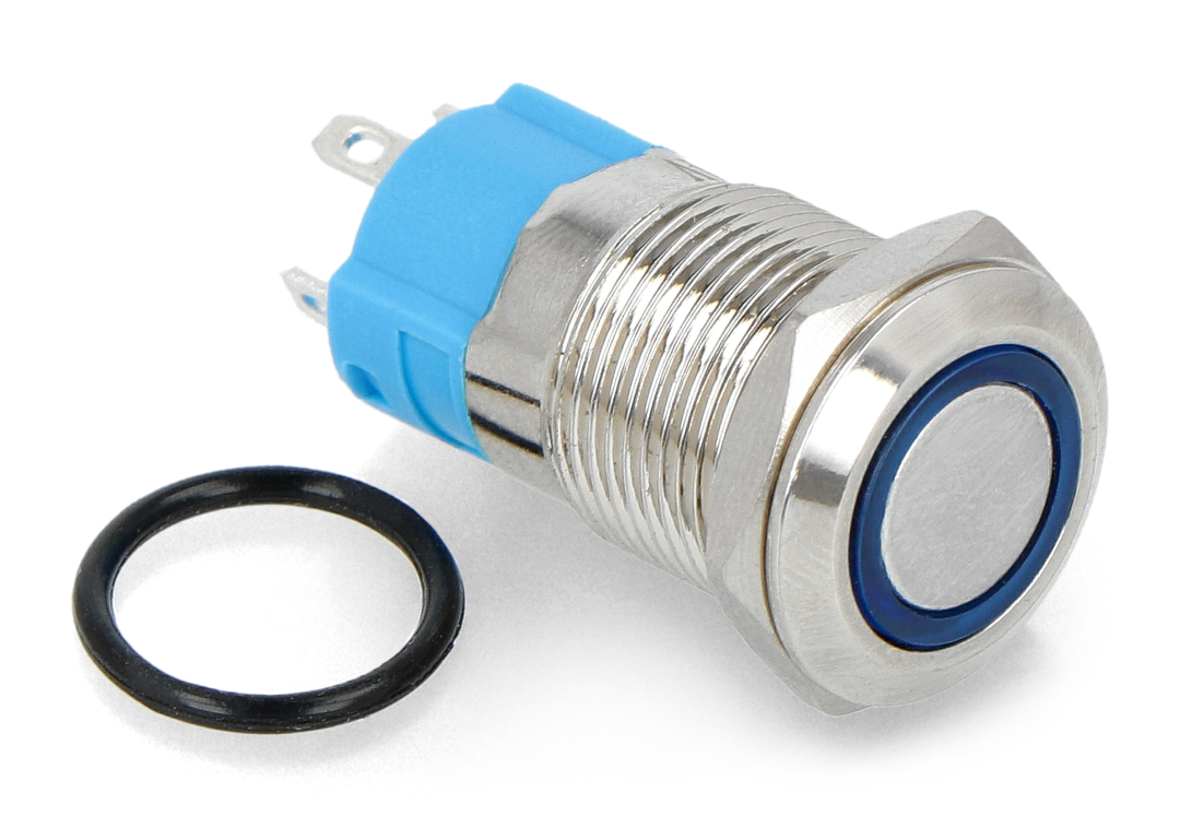 Plochý, bistabilní spínač s modrým podsvícením. Zatížitelnost kontaktů 2 A pro 250 V.