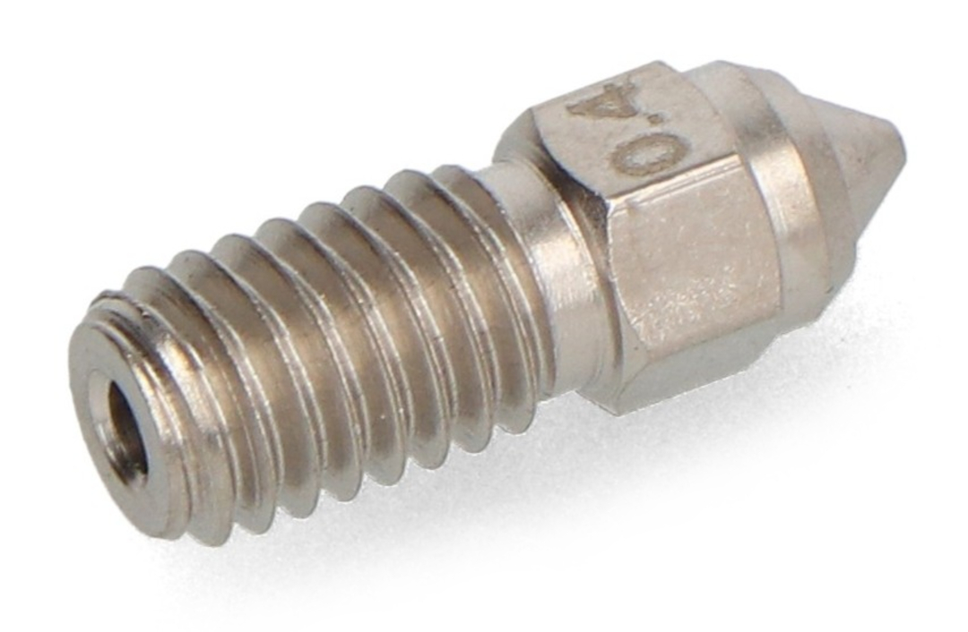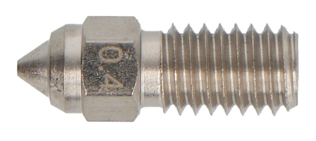 Tryska o průměru 0,4 mm je ideální pro projekty, kde je klíčová přesnost detailů a kvalita povrchové úpravy. Je ideální pro technické prototypy, funkční a dekorativní modely , stejně jako pro tisk s abrazivními materiály, jako jsou filamenty vyztužené uhlíkovými vlákny . Díky použití kalené oceli ani dlouhé tisky s obtížnými filamenty neohrozí výkon součásti.