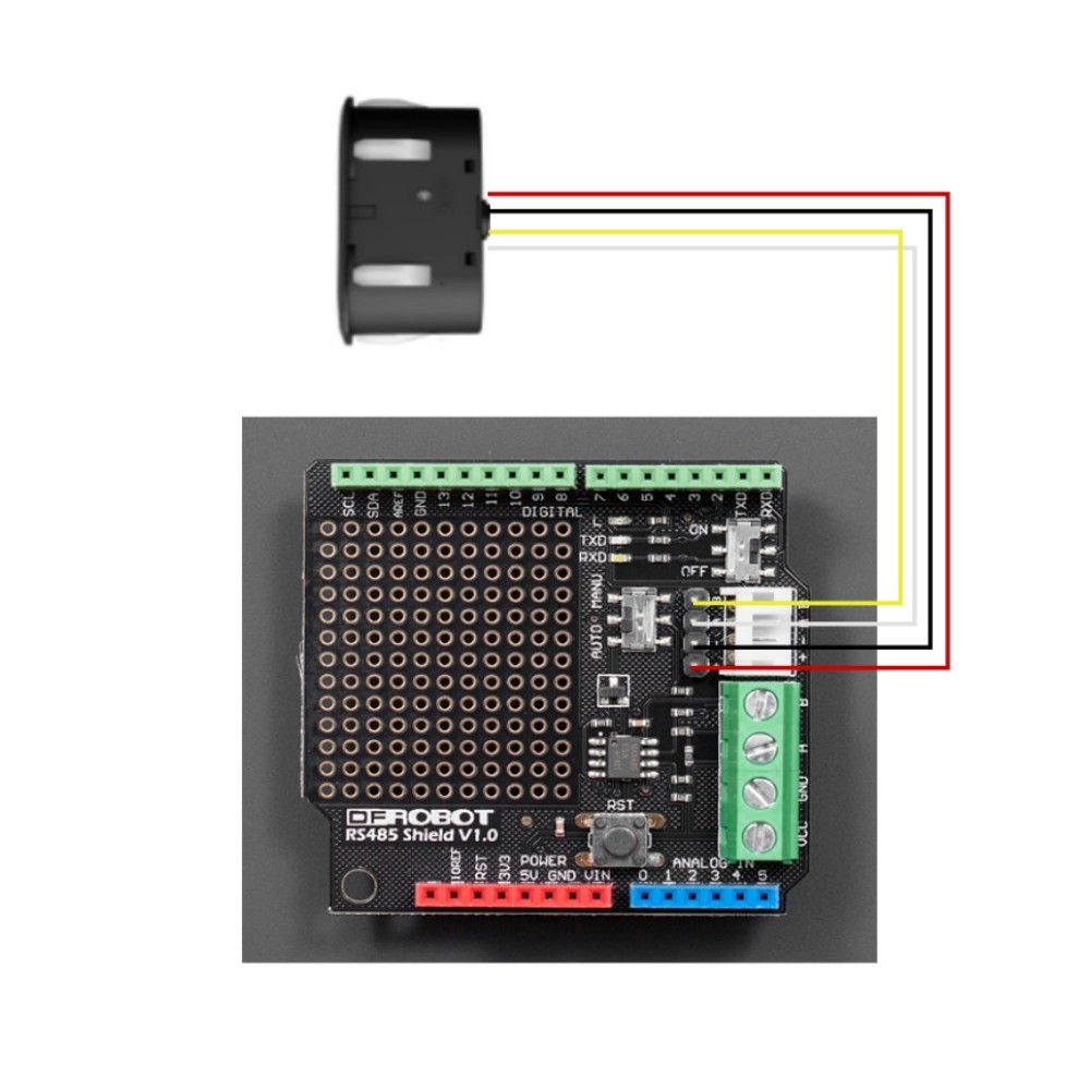 Senzor má čtyři piny: červený vodič (VCC) , černý (GND) , žlutý (RS485 vodič B) a bílý (RS485 vodič A) . Doporučené zapojení je pomocí Arduina a převodníku TTL na RS485 (např. DFR0259 ), který zesiluje signál a zajišťuje kompatibilitu rozhraní. Před spuštěním senzoru přepněte převodník do režimu „AUTO“ pro programování a poté do provozního režimu („RUN“) se standardní rychlostí 115200 bps. Tento typ konfigurace umožňuje rychlé a spolehlivé zpracování dat v robotických a automatizačních aplikacích.