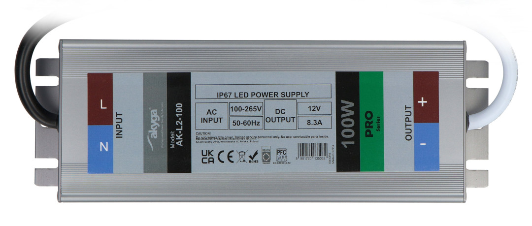 100 W napájecí zdroj určený k napájení osvětlení založeného na LED technologii, např. Pásky, žárovky, panely, RGB ovladače a další napájené 12 V DC. Díky krytí IP67 jej lze použít jak venku, tak uvnitř budovy. Maximální proudová účinnost je 8,3 A, což vám například umožňuje napájet 20m LED pásek se spotřebou 4,8 W / m. Kromě napájení LED osvětlení lze napájecí zdroj úspěšně použít v systémech průmyslové automatizace, řízení strojů atd.