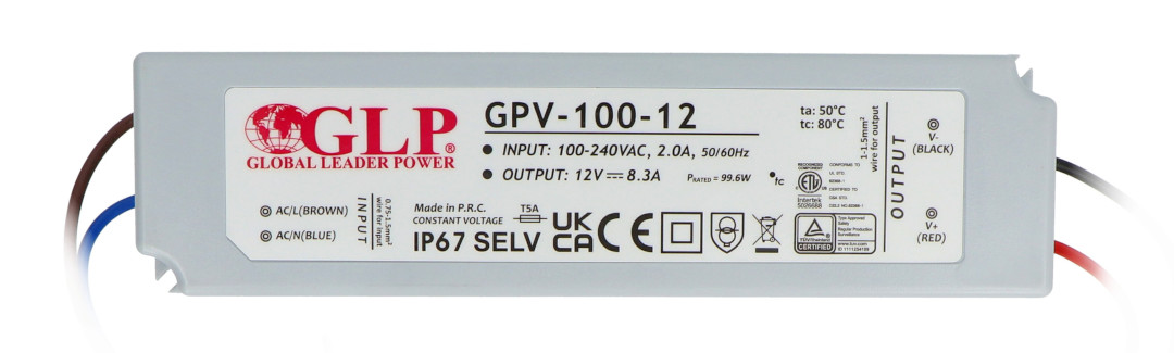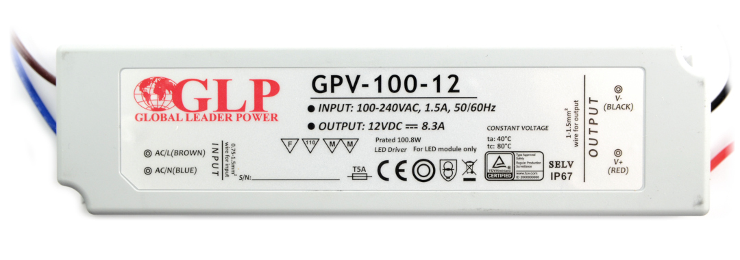 Popis produktu: Voděodolný napájecí zdroj pro LED pásky a pásky GPV-100-12 - 12V / 8,3A / 100W