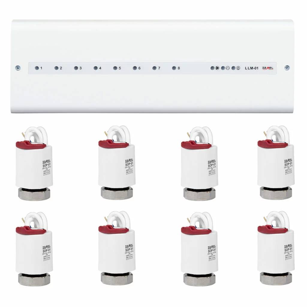 Lišta LLM-01 je centrálním modulem systému, který je zodpovědný za logické řízení topných zón, oběhového čerpadla a kotle . Funguje s drátovými termoregulátory a podporuje až 8 zón , každá s až 6 pohony. Je vybavena vizuální indikací stavu zóny, čerpadla a kotle. Pohony SOP-01 jsou termoelektrické pohony (typ NC), které přesně otevírají nebo zavírají ventily v rozdělovači podlahového vytápění . Jejich instalace je rychlá a bez použití nářadí a závit M30 x 1,5 mm zajišťuje širokou kompatibilitu.
