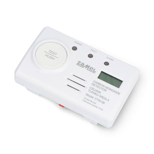 Detektor oxidu uhelnatého Zamel CTW-06 je praktické řešení, které zvyšuje bezpečnost domácnosti před účinky otravy oxidem uhelnatým. Zařízení využívá elektrochemický senzor s 10letou životností a je napájeno vestavěnou, nevyměnitelnou 3V lithiovou baterií , což eliminuje nutnost pravidelné výměny baterie po celou dobu jeho životnosti. Při detekci nebezpečné koncentrace oxidu uhelnatého detektor spustí zvukový alarm o hlasitosti přibližně 90 dB a vizuální alarm . Vestavěný LCD displej zobrazuje aktuální koncentraci oxidu uhelnatého, stav baterie, diagnostické zprávy a teplotu , což usnadňuje posouzení situace. Samodiagnostický systém monitoruje činnost senzoru a upozorňuje na poškození nebo konec životnosti.