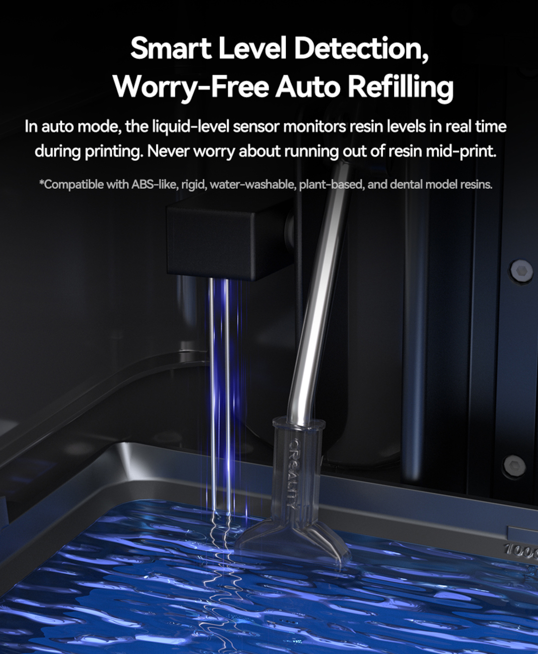 Modul je vybaven pokročilým systémem sledování hladiny pryskyřice , který automaticky doplňuje nádržku, když hladina klesne pod požadované minimum. To pomáhá předcházet přerušením a zajišťuje plynulý chod tiskárny. To je nepostradatelná funkce pro dlouhé a náročné projekty.
